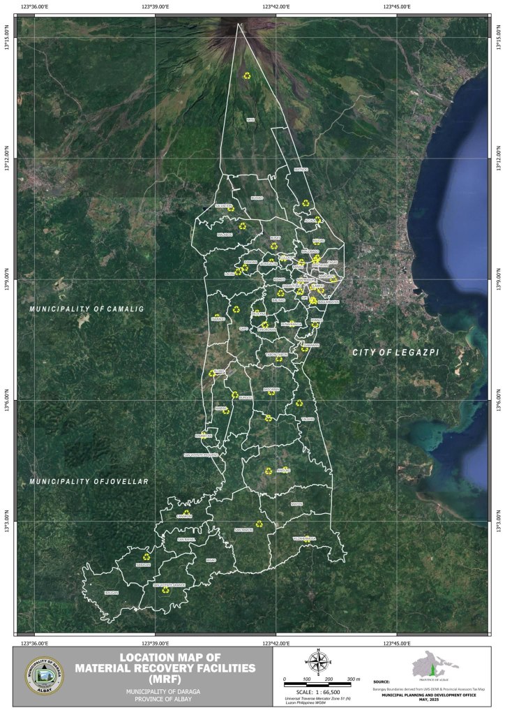 “In detail: Map of Daraga highlighting every barangay’s MRF’s location.”